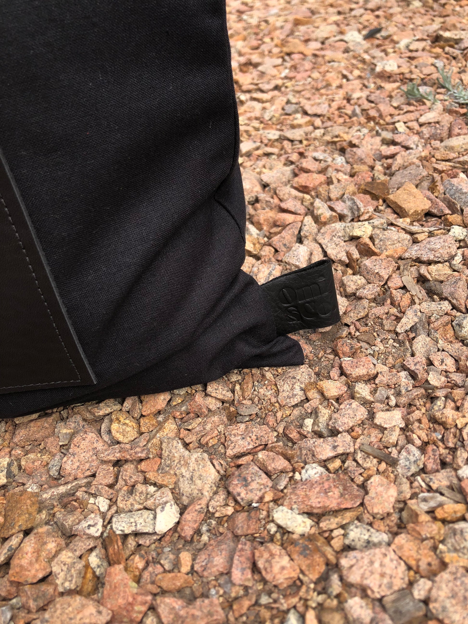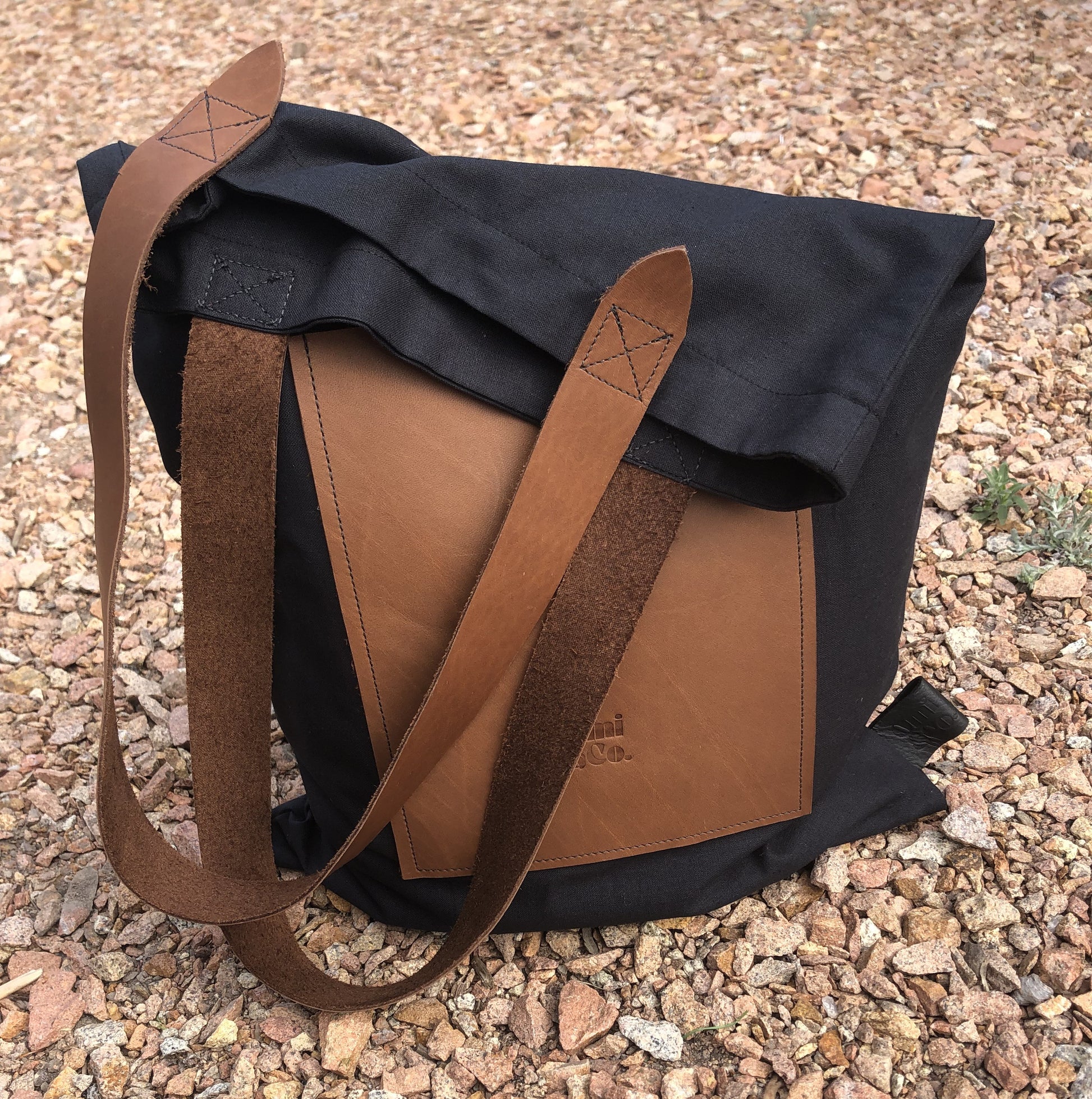Made from sturdy cotton with leather front pocket and matching leather straps, this bag is as stylish as it is practical.